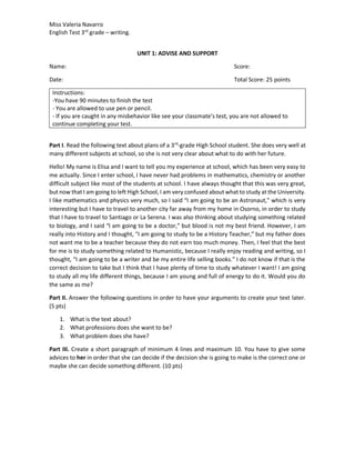 This document contains an English test for a 3rd grade student. It discusses a student named Elisa who is unsure about what career path to pursue after high school. She is good at many subjects but cannot decide between becoming an astronaut, doctor, history teacher, or writer. The test asks the student to advise Elisa on making this decision and discuss their own future plans and any advice their parents have given. It provides instructions for the test and contains multiple choice and paragraph writing questions.