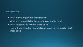 This document provides guidance on developing an effective business plan. It explains that a business plan is a 25-35 page written document that describes a new business idea and how it will achieve its goals from marketing, financial, and operational perspectives. An effective business plan answers questions about the business opportunity, product or service, target market, costs, potential profits, investment needs, and risks. It includes sections on the executive summary, company description, products/services, industry and market analysis, marketing plan, operations plan, management team, financial plan, implementation timeline, and appendices. The business plan should establish goals, objectives, strategies, and quantifiable marketing plans for startup, first years, and future periods. An professional presentation of the