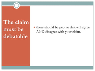 The document provides guidance on writing a debatable claim for an argumentative research paper. It explains that a good claim takes a position that reasonable people may disagree on. It offers examples of debatable claims and non-debatable claims. Tips are given for writing an effective claim, such as clearly stating your topic and opinion without subjective language, and briefly referencing the evidence and recommendations that will support the claim. A sample claim on the topic of workplace discrimination is also presented.
