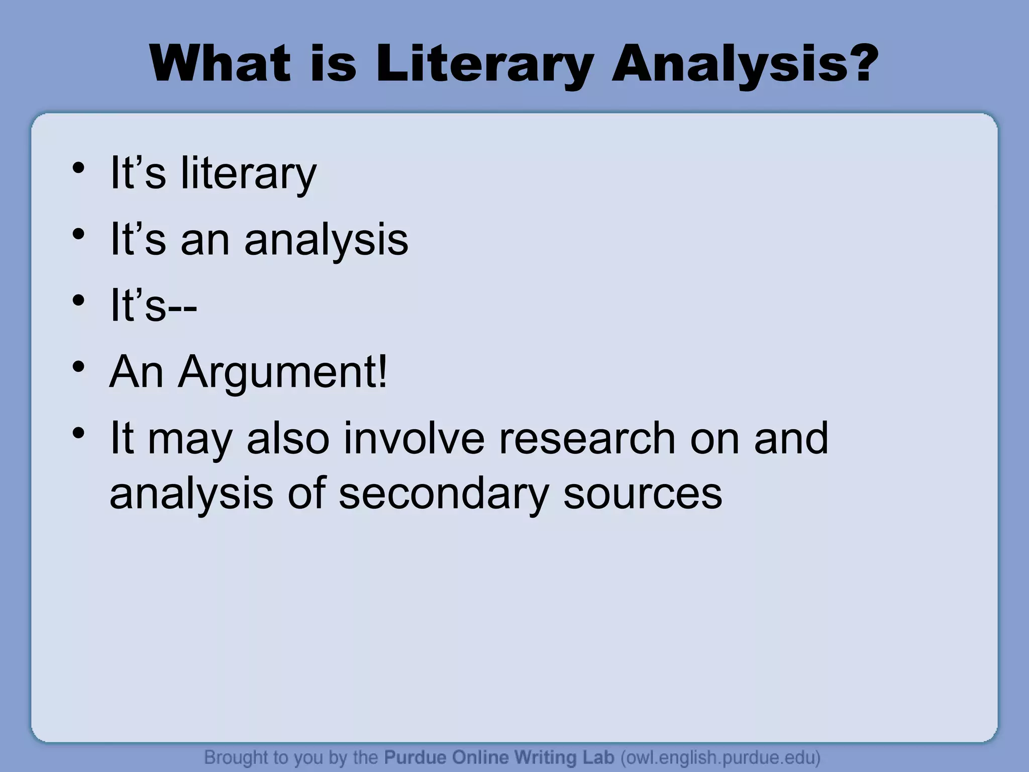 This document provides guidance on writing a literary analysis. It explains that a literary analysis involves making an argument about specific attributes of a literary text using evidence from the text and secondary sources. It outlines important concepts to analyze such as plot, character, symbolism and historical context. The document advises finding and appropriately integrating secondary sources to support your thesis statement while making your own argument the focus. Writers are told to consult references on literary terms and criticism to learn more about analyzing texts.