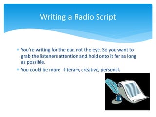 The document provides guidance on writing a radio script. It discusses making the script engaging for listeners by grabbing their attention and telling a story with a beginning, middle, and end. The script should have a conversational style and be visual, concise, energetic and mix up sentence structures. Transitions between narration and audio clips should be written. Proper formatting is also important, with labels for narration, audio clips and ambient noise or music. Numbers and abbreviations should be written out to aid clear reading aloud.