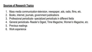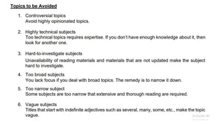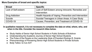 The document discusses writing a research title that encapsulates the main idea and variables of a research paper. An effective title is concise yet informative, specifying the what, where, who, and when of the study. It gives two examples of research titles that clearly express the topic, location, participants, and time period. The title is the most important element as it communicates the problem or issue being explored to readers.