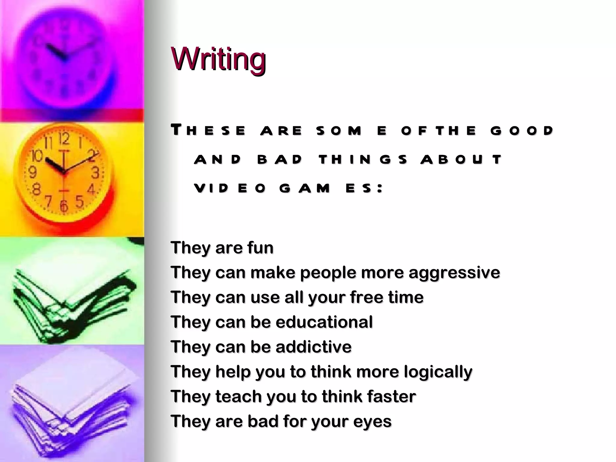 The document lists both positive and negative aspects of video games. The positive aspects include that video games are fun, can be educational, help people think more logically and think faster. The negative aspects are that video games can make people more aggressive, use up all free time, be addictive, and are bad for eyes. The document also discusses adding information to provide more details and contrasting information to highlight unexpected or opposing aspects.