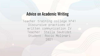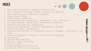 This document provides advice on various aspects of academic writing such as developing arguments, organizing essays, using thesis statements, writing introductions and conclusions, taking notes, avoiding plagiarism, revising writing, and improving spelling. It addresses common errors and offers tips for using punctuation correctly. The document also discusses summarizing sources, using quotations and paraphrasing, and referencing sources using different citation styles.