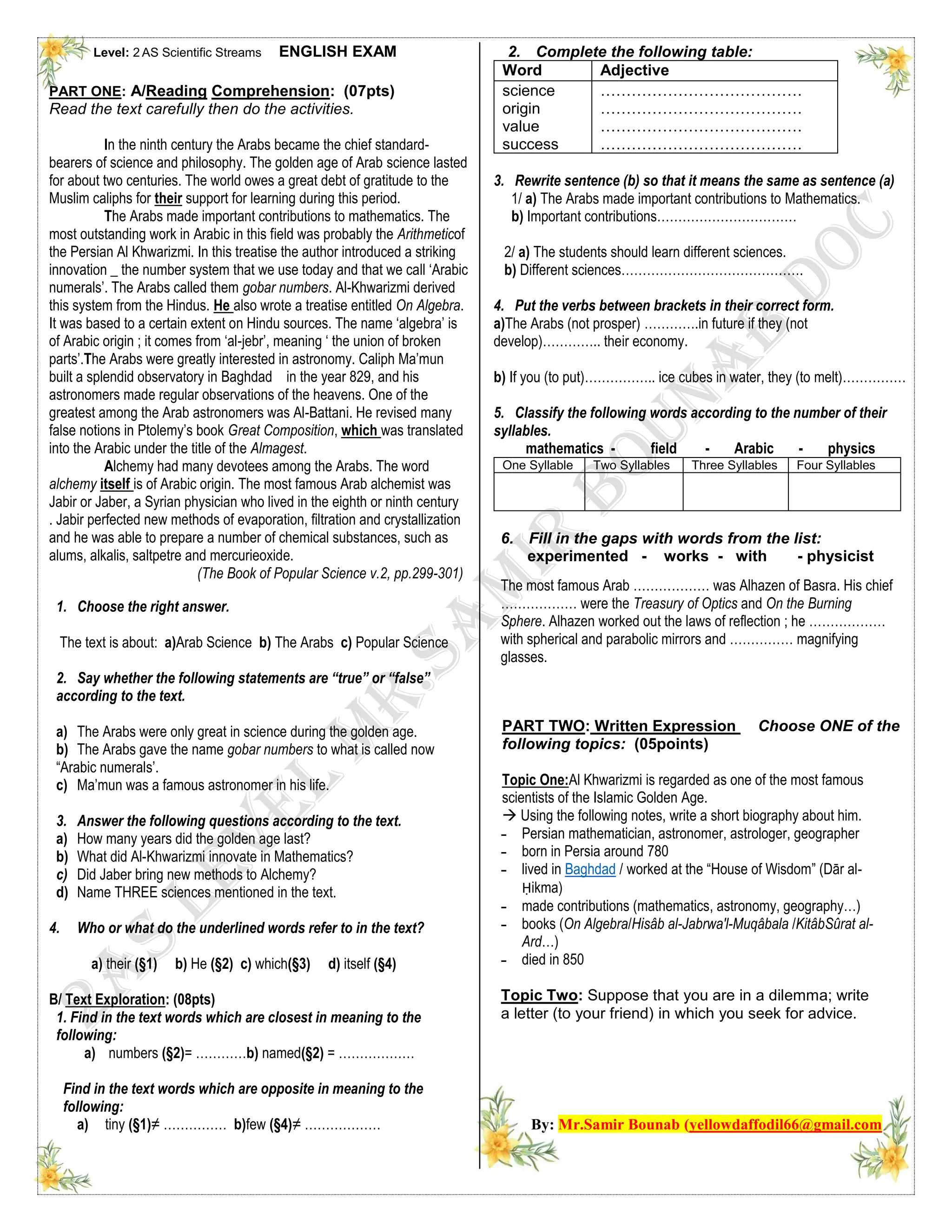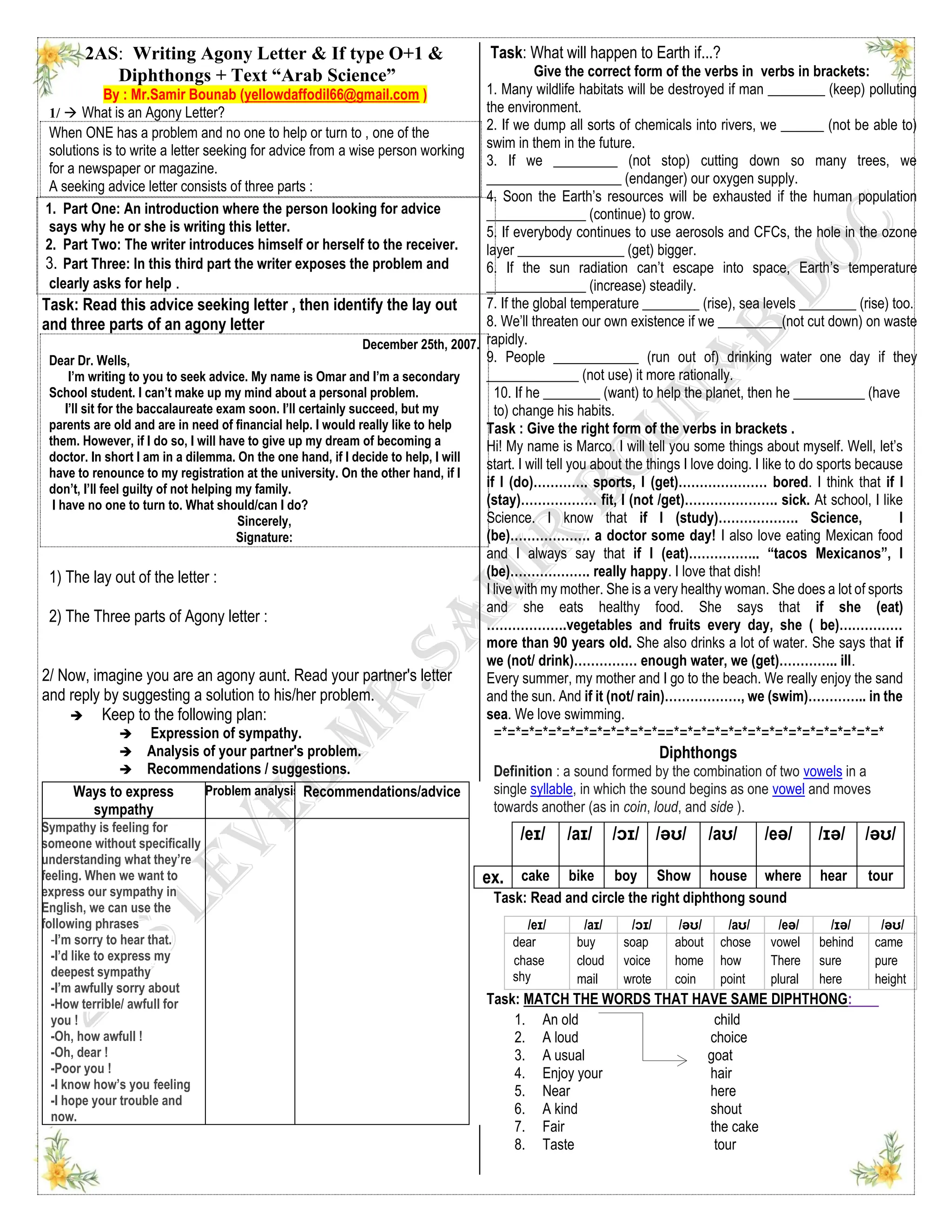 The document discusses the concept of an agony letter, which is a means for individuals facing dilemmas to seek advice from a knowledgeable source. It outlines the structure of such letters, emphasizes the importance of expressing sympathy and analyzing problems in responses, and includes language exercises related to conditional verbs. Additionally, it touches on the significant contributions of Arab scholars to science during the golden age, particularly in mathematics and astronomy.