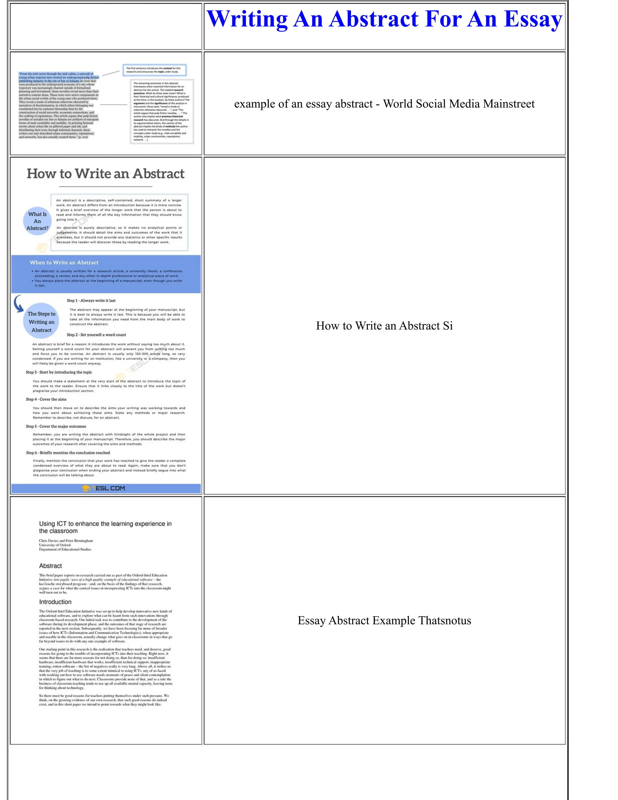 This document provides guidance on writing abstracts for various types of academic works, including essays, research papers, dissertations, and reports. It discusses what an abstract is, how to structure an abstract in APA style with different sections, and includes examples of both good and bad abstracts. Tips are provided such as keeping an abstract concise at 100-250 words and focusing on the purpose, methods, results, and conclusions of the work being abstracted.