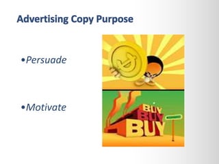 This document discusses key concepts in advertising including the purpose of advertising copy to persuade and motivate audiences. It outlines important considerations for crafting advertisements like understanding the audience, their demographics and psychographics. Elements of the product being advertised and formats for broadcast commercials are examined. The document also explores different types of advertising appeals including ethical, logical and emotional appeals. An activity is described where students analyze a picture to come up with a product and advertising approach, and an assignment is given to write a 30 second TV script.