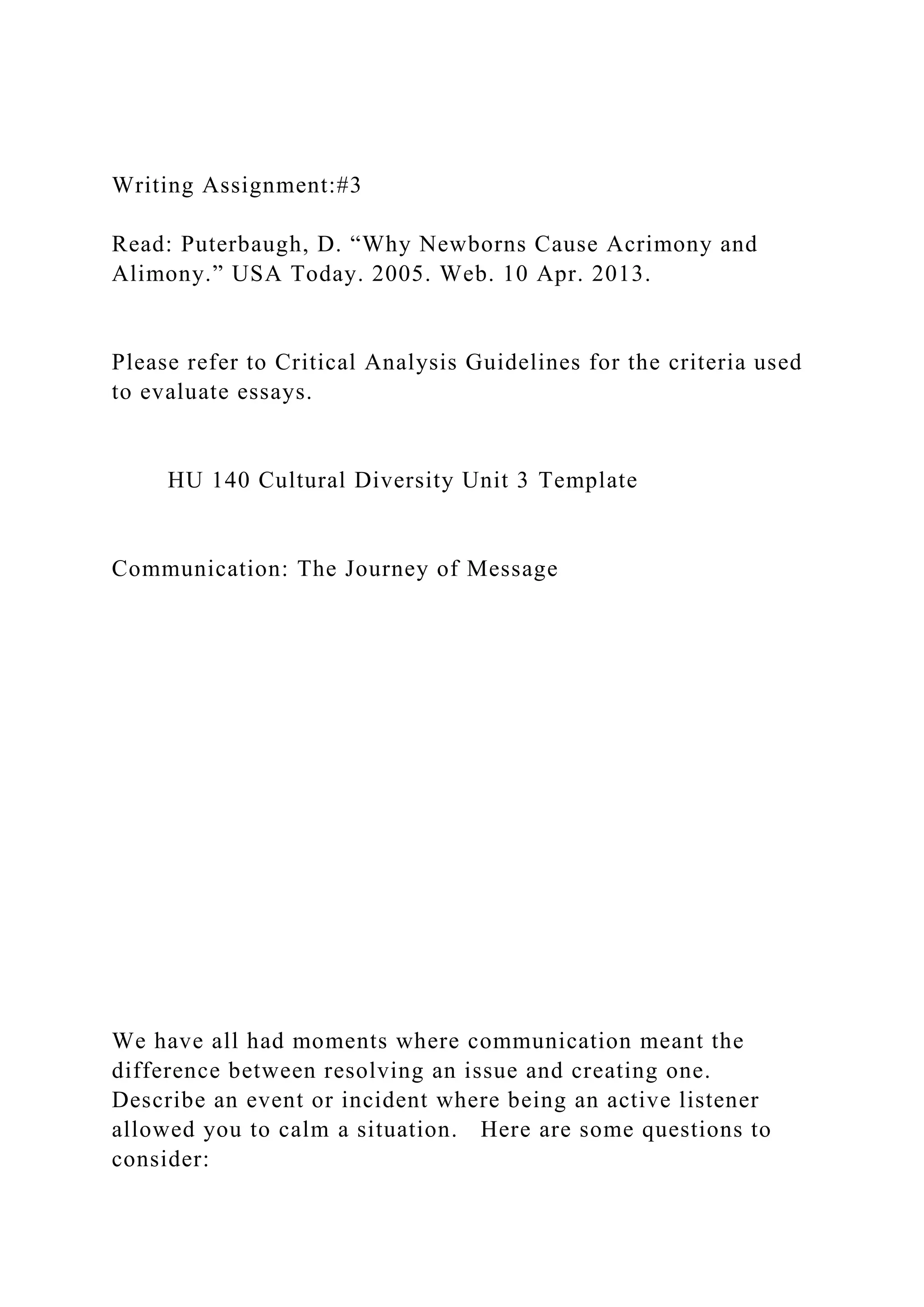The document outlines a writing assignment focused on communication, cultural diversity, and the effects of medical experimentation on children. It includes tasks such as reflecting on personal experiences of effective listening, analyzing visual art representation of diversity, and critiquing literature that highlights issues faced by marginalized communities. It emphasizes the need for better communication practices to address injustices and encourages critical engagement with topics like the pharmaceutical industry's treatment of children.