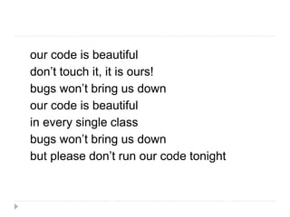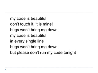 Документ освещает принципы написания чистого и компактного кода исполняемых спецификаций, предлагая десять шагов для улучшения кода тестов, включая использование приемочных тестов и динамических языков. Он подчеркивает важность тестировщиков как полноправных участников процесса разработки и обсуждает проблемы качества кода тестов по сравнению с кодом продукта. В документе также представлены практические примеры и рекомендации по автоматизации тестирования.