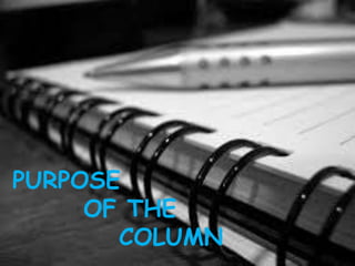 The purpose of a column is to inform, interpret, and critique events for readers. A good columnist explains the background and consequences of news, determines if events are isolated or part of patterns, and how events may affect readers. They also assess different perspectives from society. A columnist should write well, be original, observe keenly, think logically, have a wide background, and be resourceful and fair. There are different types of columns, including text, number, date/time, and location columns for different kinds of data.