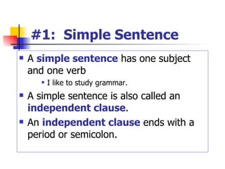 This document discusses the four types of sentences: simple, compound, complex, and compound-complex. It defines each type and provides examples. A simple sentence contains one subject and one verb. A compound sentence contains two or more independent clauses joined with a comma and FANBOYS conjunction. A complex sentence contains one independent clause and one dependent clause. A compound-complex sentence contains at least one dependent clause and two or more independent clauses.