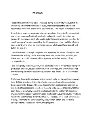 The document is a collection of personal letters from various poets, professors, critics, and editors, reflecting on the author's experiences and memories over fifty years. It serves as a memoir, providing insights into personal, professional, and academic life while emphasizing the supportive role of correspondents in the author's literary journey. The letters not only document relationships but also present a broader understanding of literary and cultural contexts, encouraging readers to explore the connections within their own lives.