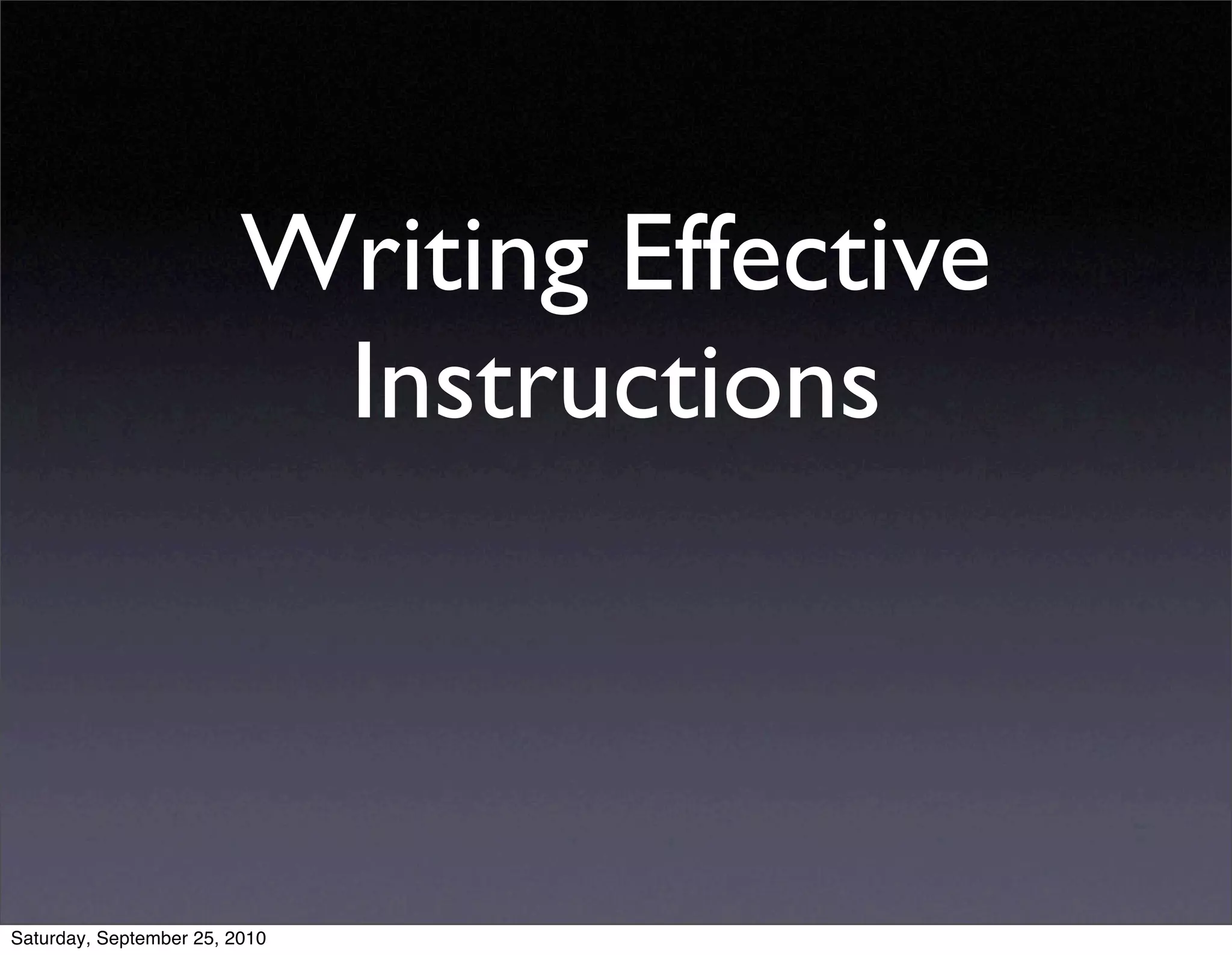 This document discusses how to write effective instructions by analyzing the audience, structuring instructions appropriately for their level of experience, using precise language and parallel structure, providing enough but not too much information, employing helpful organization methods like lists and graphics, and testing instructions for usability.