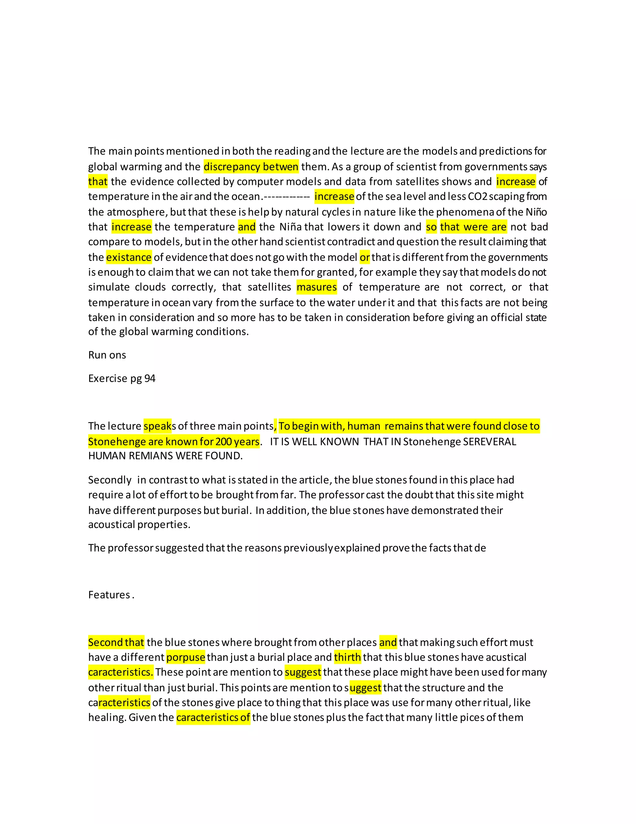 The document summarizes the main points from a reading and lecture about models and predictions of global warming, and the discrepancies between them. A group of government scientists say evidence from computer models and satellite data shows rising air and ocean temperatures, rising sea levels, and less CO2 being absorbed by the atmosphere. However, natural cycles like El Niño and La Niña affect temperatures yearly. Other scientists question the results, claiming evidence that does not match models or is different from government data is enough to say the models cannot be fully relied upon. Areas of disagreement include how well models simulate clouds, the accuracy of satellite temperature measurements, and differences between ocean surface and subsurface temperatures. More needs to be considered before making definitive statements about global warming