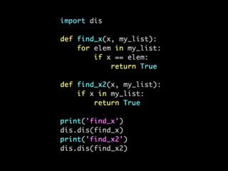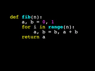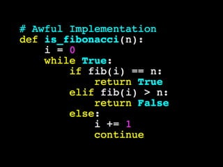 The document discusses optimizing Python code performance through profiling. It introduces various profiling tools like cProfile and line_profiler. As an example, it profiles a "fibonachicken" function that uses Fibonacci numbers to calculate the number of chickens needed to serve a given number of people. Profiling reveals the fib() and is_fibonacci() functions as bottlenecks. The document suggests improving fib() with Binet's formula and is_fibonacci() with Gessel's formula to avoid using fib() and gain better performance.
