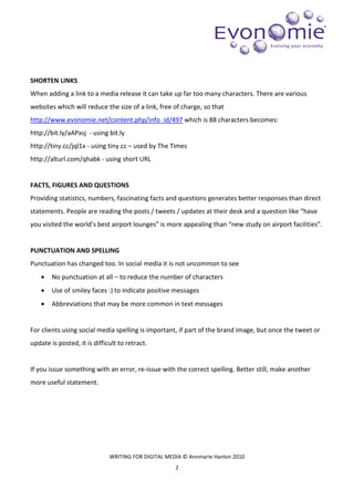 The document discusses best practices for writing for digital media. It emphasizes writing in a personal tone using the first person and keeping content short and engaging to grab readers' attention quickly. Key points include writing headlines that compel readers in 3 seconds, keeping social media updates short and conversational, and repurposing content across multiple platforms like blogs and social networks. Facts, questions and statistics are recommended over direct statements to generate better responses from readers.