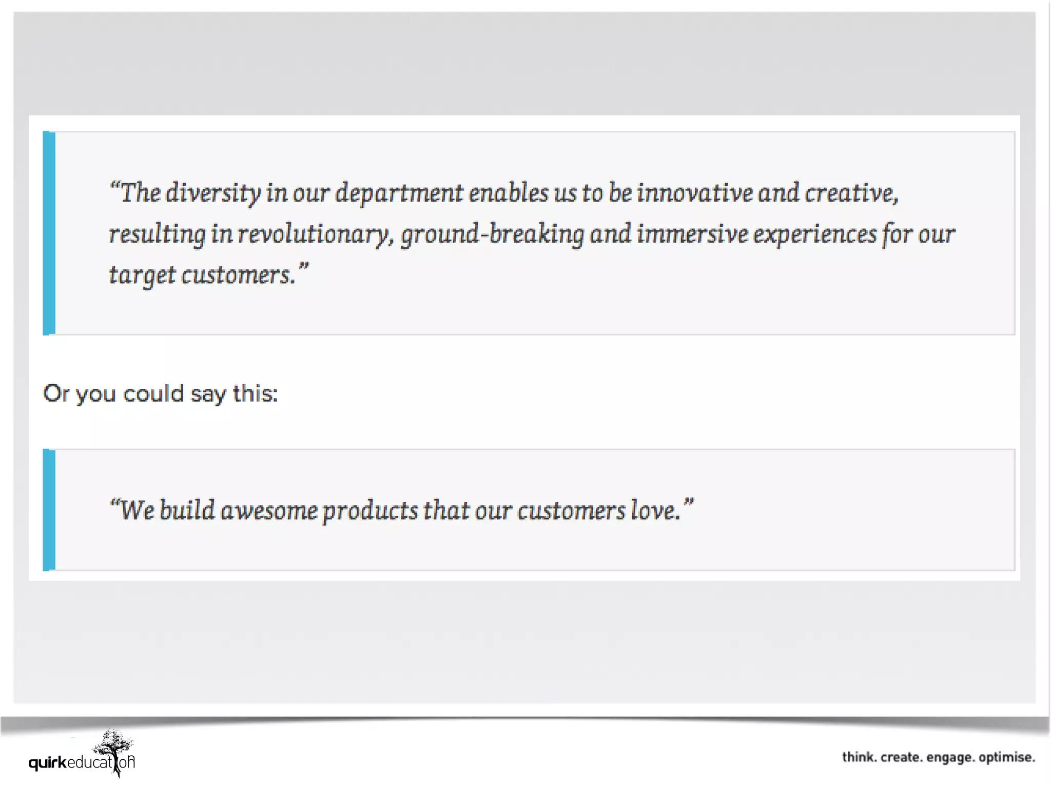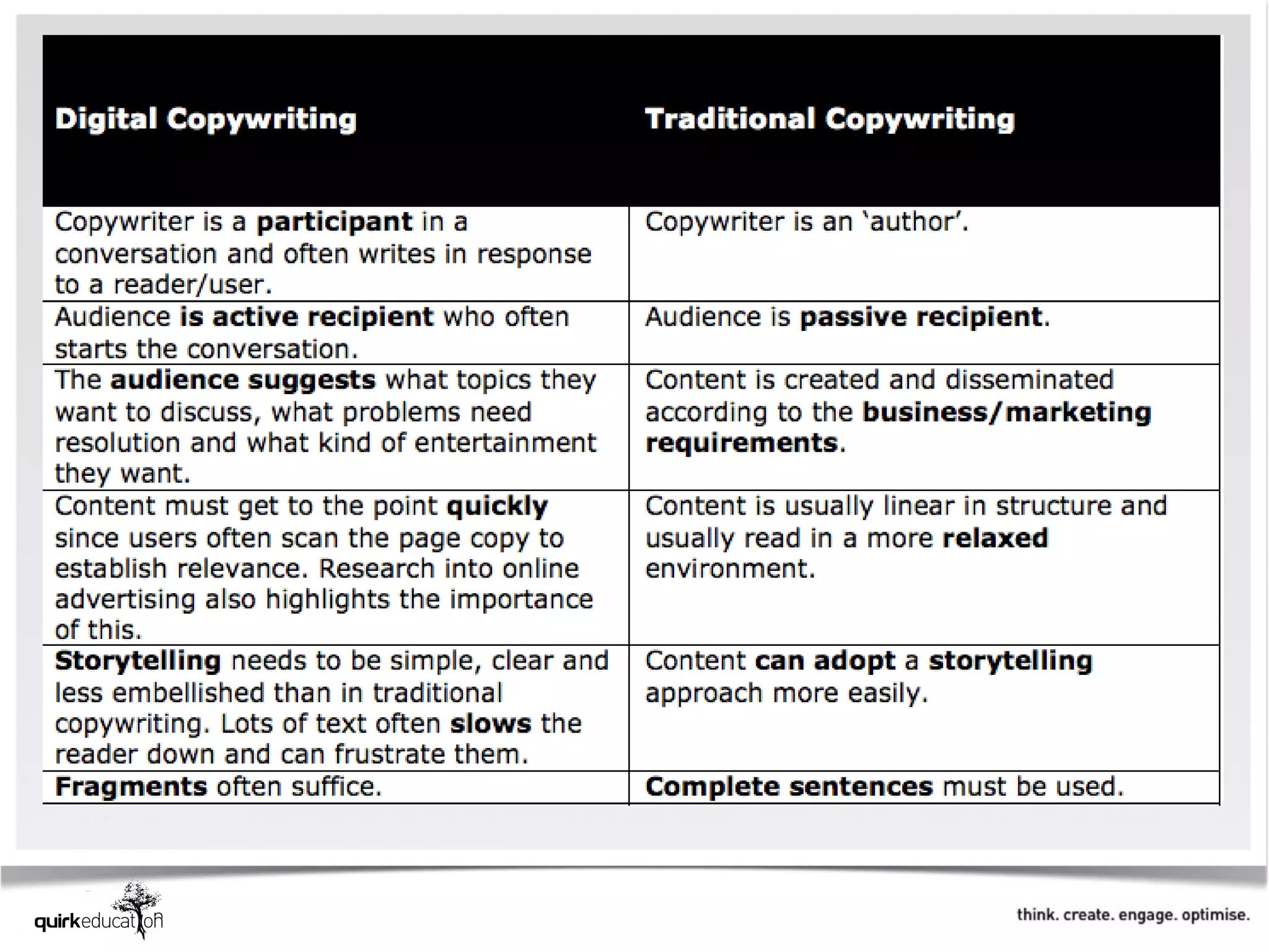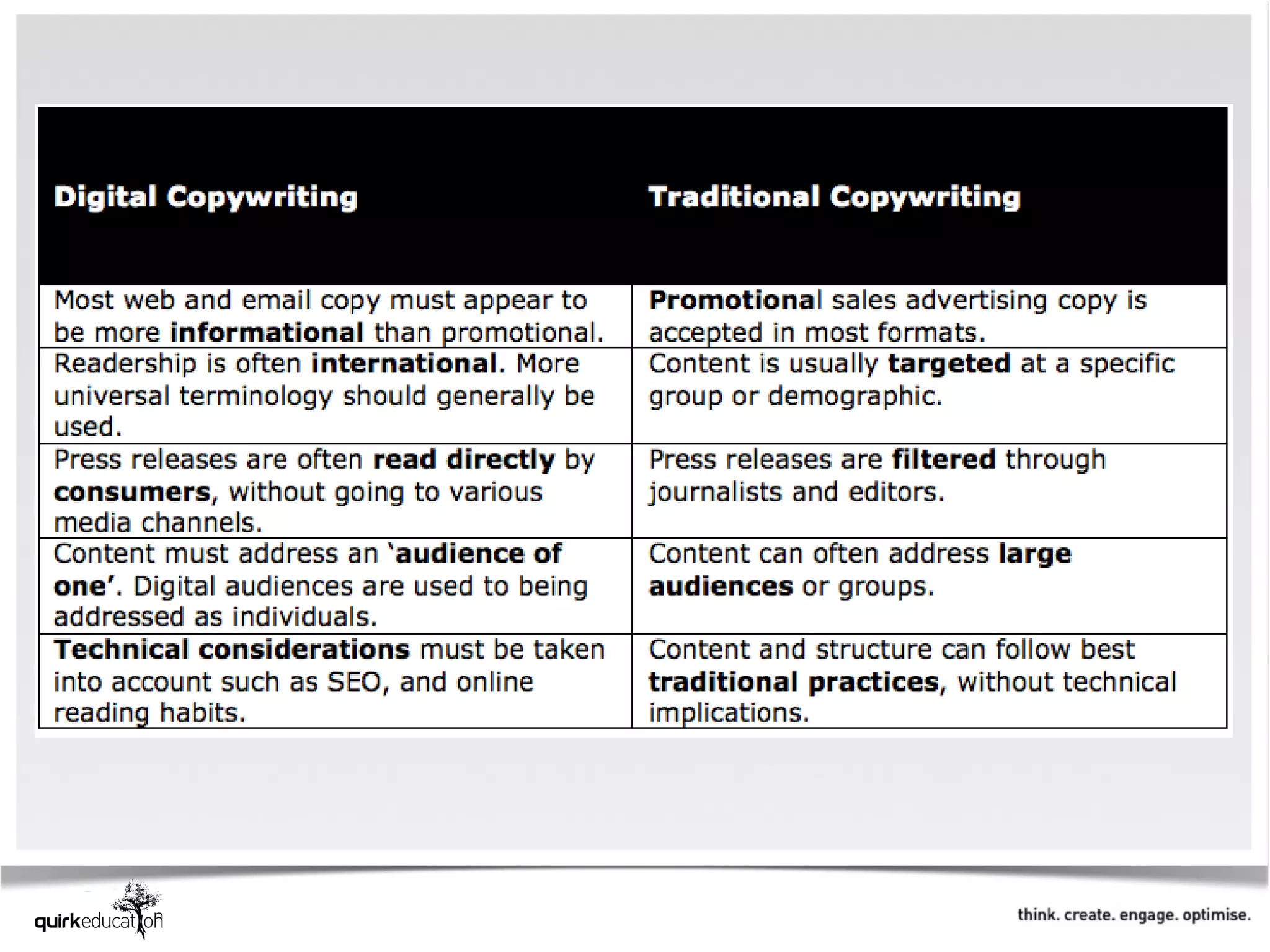 The document discusses digital copywriting and provides tips for writing effective digital content. It notes that digital copywriting is different than traditional print copywriting and involves tailoring content for different online contexts. It emphasizes researching the target audience through creating detailed personas and writing with an audience of one in mind. The document also discusses using storytelling techniques and establishing a clear tone of voice aligned with the brand. It highlights the importance of digital content being results-driven by focusing on business goals and key performance indicators.