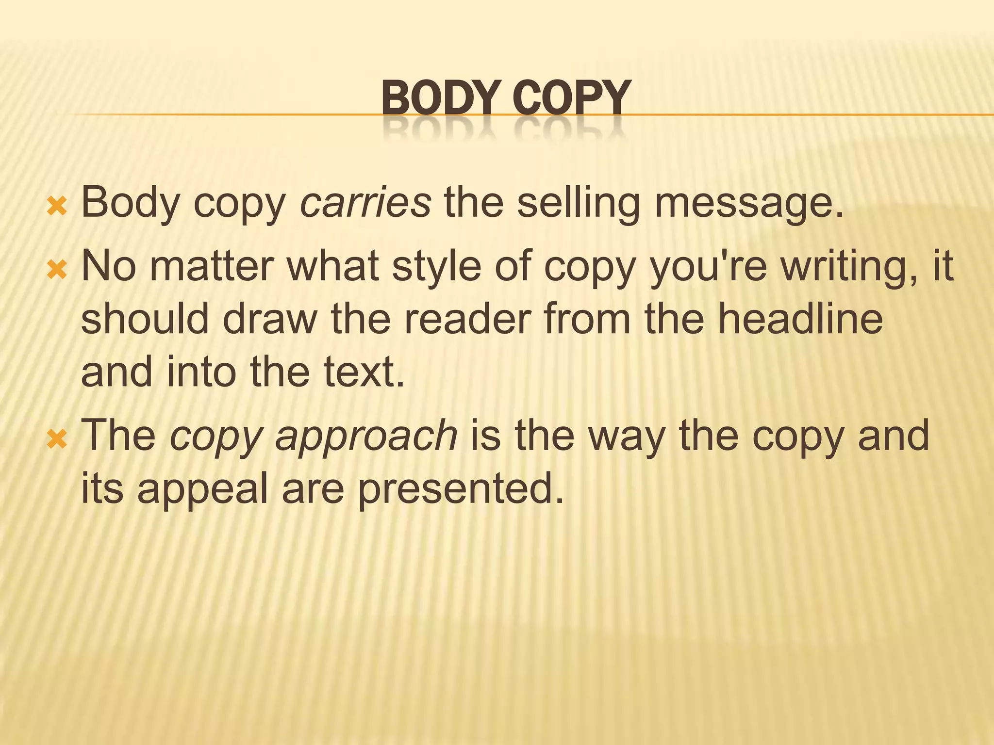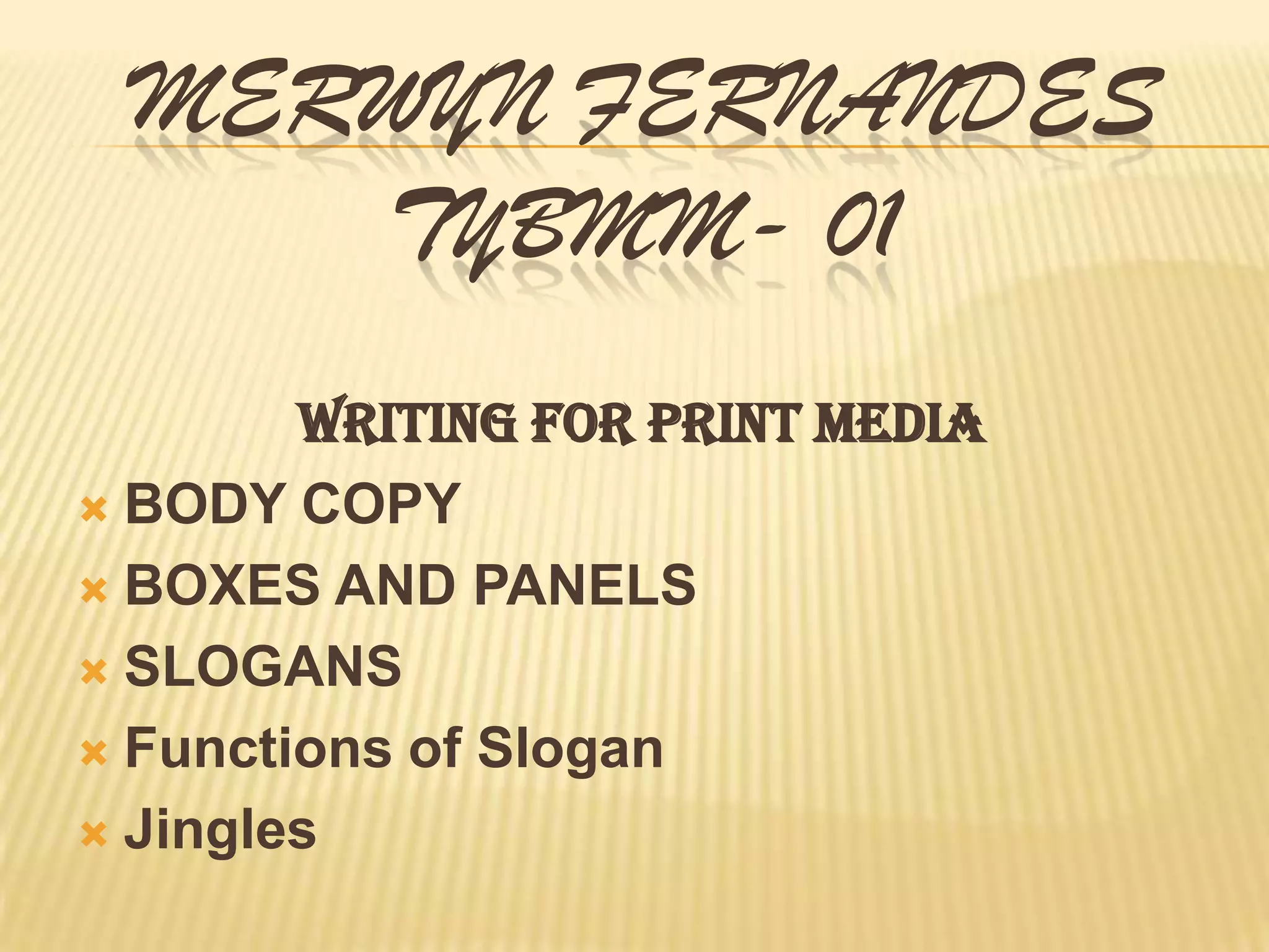 This document discusses different elements of print advertising copywriting including body copy, copy approaches, boxes and panels, slogans, and jingles. It provides details on developing body copy using factual, narrative, and emotional approaches. Boxes and panels are described as tools for framing important information. Slogans are defined as short phrases that summarize the advertising message, and techniques for writing effective slogans are outlined. Finally, jingles are introduced as catchy tunes that have high recall value when used in advertising.