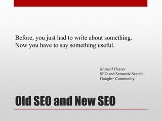 The document discusses writing content for semantic search. It emphasizes writing for humans by using natural language, answering questions, and connecting related concepts to show search engines the relevancy of content. Proper content structure, keywords, internal links, and structured data help search engines understand the meaning and intent behind text. The goal is to resonate with readers by solving their problems and driving them to take action on one's website.