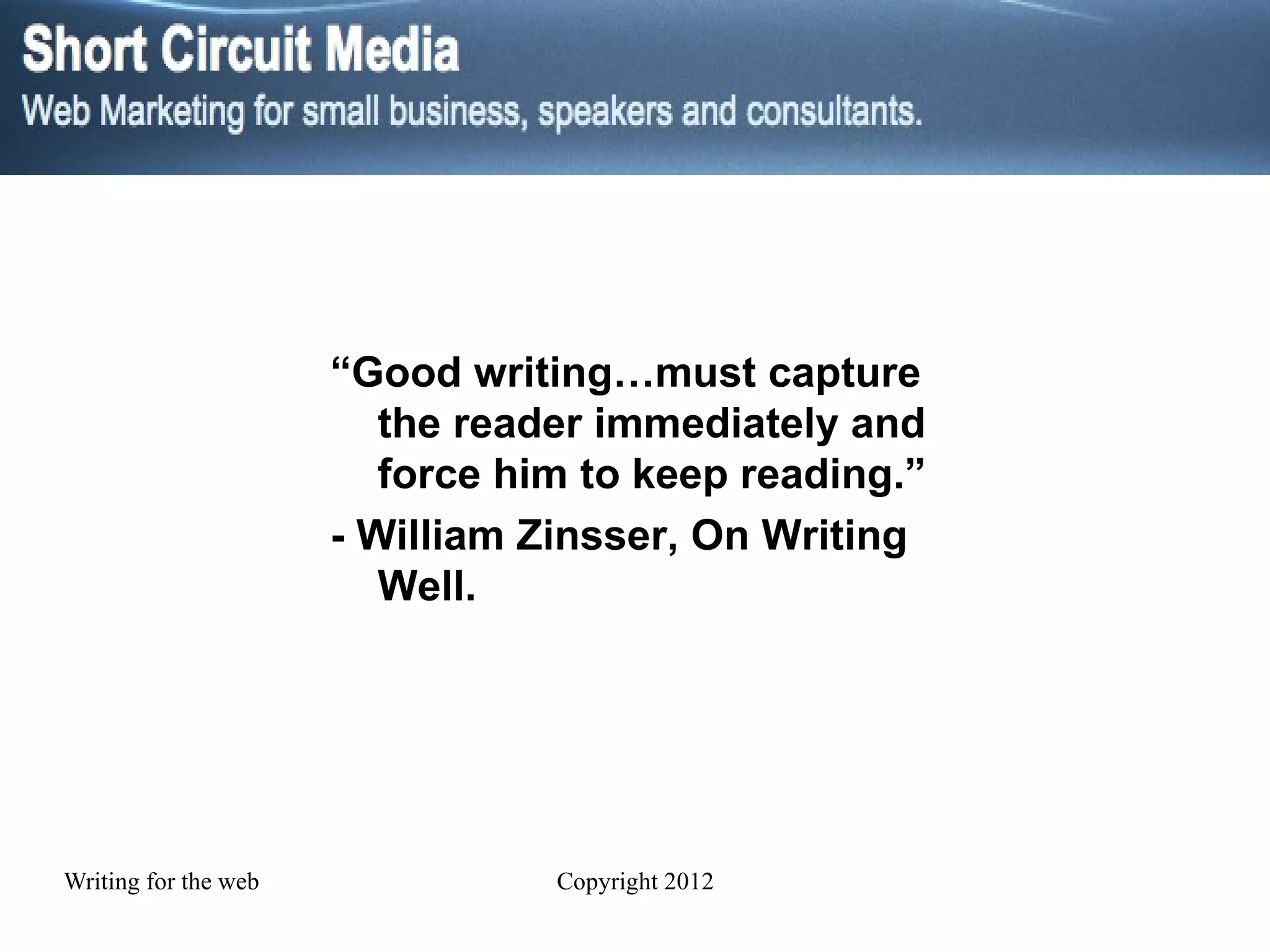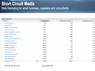 The document provides tips for effective online writing including keeping content concise yet engaging, using an active voice and conversational tone, incorporating lists and keywords, and focusing on the needs of the target audience. Proper formatting, spelling and avoiding jargon are also emphasized. The overall goal is to communicate clearly and reinforce the company brand in a way that captures readers and keeps them engaged with the content.