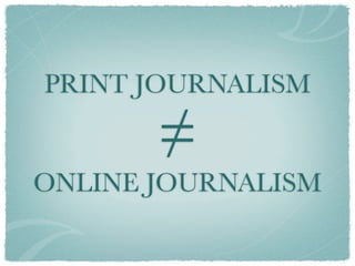 The document discusses several key differences in how people consume information online versus in print. It notes that online readers skim content quickly, jumping from site to site and avoiding ads. Writers should focus on concise paragraphs, lists, and explanatory subheads to engage these readers. Interactivity like links, videos, and live chats can also better suit online formats by taking advantage of the web's capabilities. Metrics should track what content is popular and how readers find the site to refine future writing strategies.