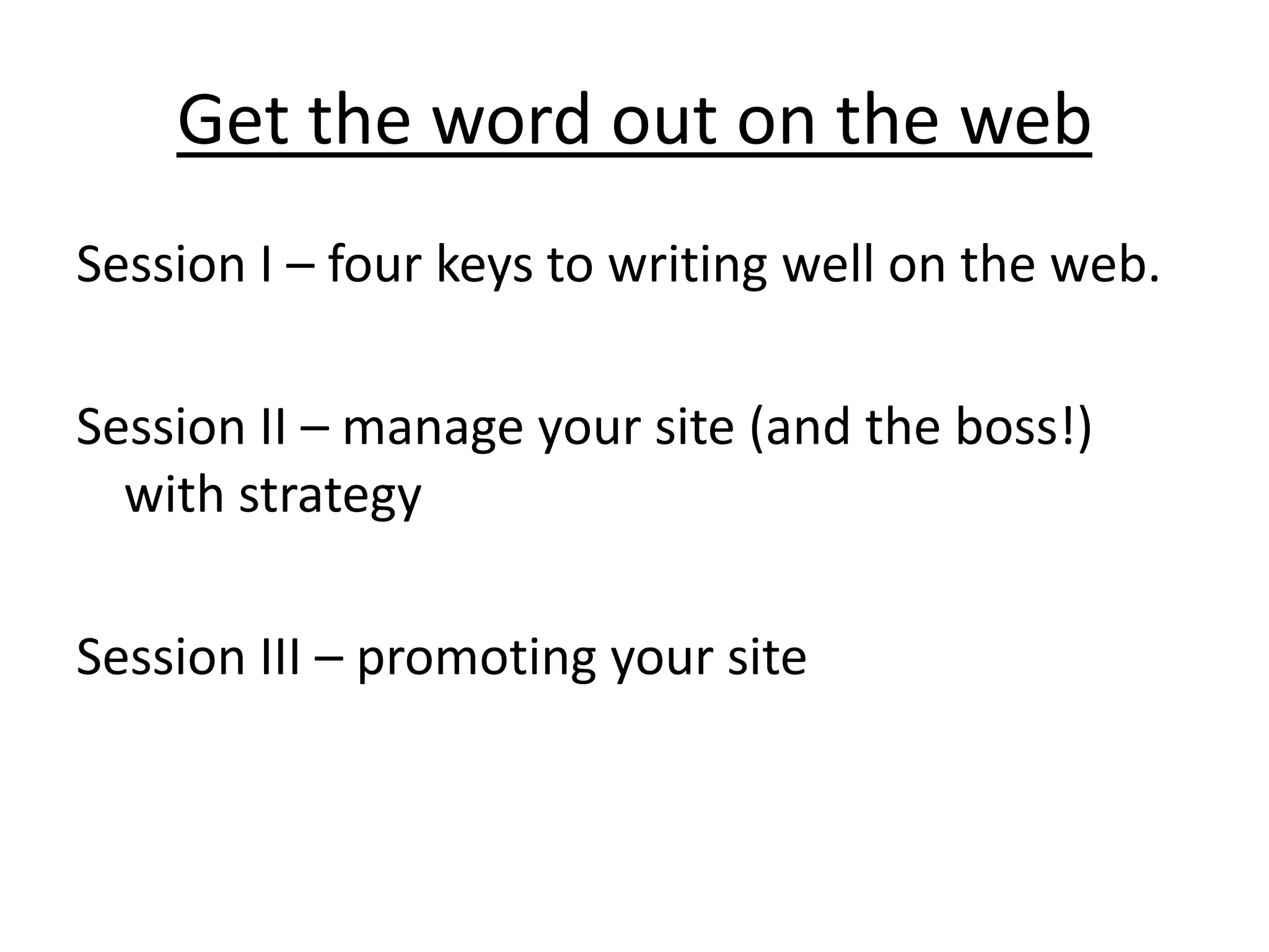 This document discusses four keys to writing well on the web: keep it simple, keep it updated, keep it interesting, and keep it authoritative. It provides examples of websites that exemplify these principles and urges readers to focus on a few communication goals and be the authority in their area. The document also previews that the next session will cover website strategy, measurement, and managing stakeholders.