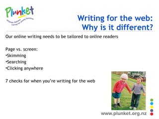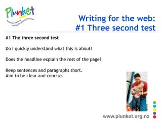 The document discusses 7 checks for writing effectively for the web. These include: 1) The three second test - ensure the headline and first paragraph are clear and concise. 2) The ID test - make it clear who owns the content. 3) The "So What??" test - ensure the content is relevant and what readers expect. 4) The "Yeah Right!" test - ensure the content is up-to-date, reliable and trustworthy. 5) The serenity test - ensure the page is well-organized and visually pleasing. 6) The accessibility test - cater to all types of readers and technologies. 7) The found-in-space test - ensure the page makes sense on its own and provides