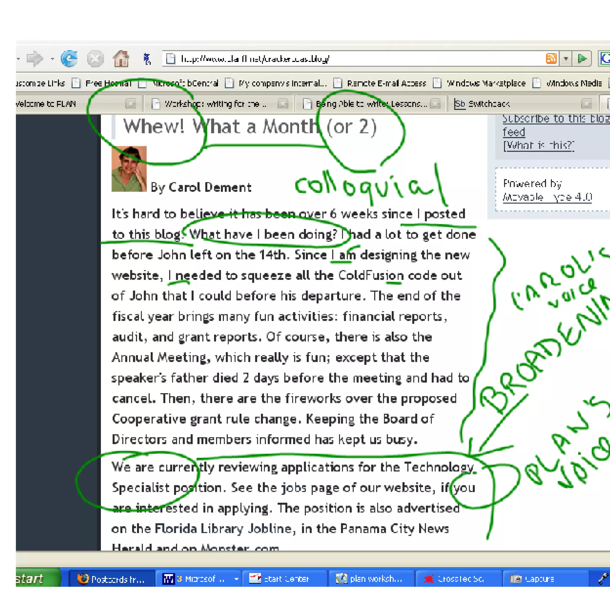 Smartboard slides that accompanied a writing workshop given on November 16, 2007 at the Panhandle Library Access Network. These slides won't make sense to anyone except the attendees. I did love that smartboard!