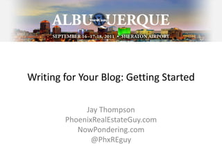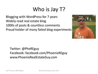 This document summarizes a presentation by Jay Thompson on starting a blog. It introduces Jay Thompson as an experienced blogger with real estate and personal blogs. The presentation covers why to blog, techniques for writing headlines and managing comments, optimal article length and posting frequency. It also lists resources that Thompson recommends for writing, editing, SEO and plugins to use for blogs.