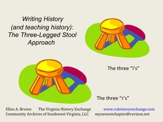This document discusses an approach to writing history called the "three-legged stool" which involves reading, researching, and writing. It emphasizes the importance of combining inspiration, information, and imagination when crafting historical narratives. Inspiration can come from primary sources while information is found through secondary sources and research. Writing history well requires setting the scene, developing characters, and weaving them into relationships and plots. Both fiction and nonfiction works are discussed as examples to consider when teaching history through literature.