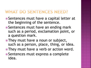 This document provides information and examples about sentence structure and fragments. It states that sentences must have a capital letter, ending punctuation, a subject and verb, and express a complete idea. It then gives examples of proper sentences and identifies fragments that are missing subjects or verbs or do not express a complete thought. It concludes by explaining the three reasons a sentence may be considered a fragment: lacking a subject, verb, or expressing an incomplete thought.