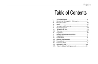 The document provides an overview of various English grammar concepts including structural analysis, prefixes/suffixes/roots, homonyms/homographs/heteronyms, word association, idioms, synonyms/antonyms, figures of speech, verb tenses, and the functions of verb tenses like the simple present and present progressive. It defines and provides examples for each concept across 17 sections.