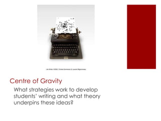 This document provides an overview of various writing strategies and theories. It discusses that there is no single process that defines how all writers write, and that writing is thinking and learning to write comes through writing and reading. It emphasizes that writers need choice, time, models of good writing, and constructive feedback. Evaluation of writing should highlight strengths and areas for improvement. The document also discusses different types of knowledge related to writing like declarative, procedural and conditional knowledge. It provides examples of different writing practices and enabling constraints that can be used to teach writing while allowing flexibility.