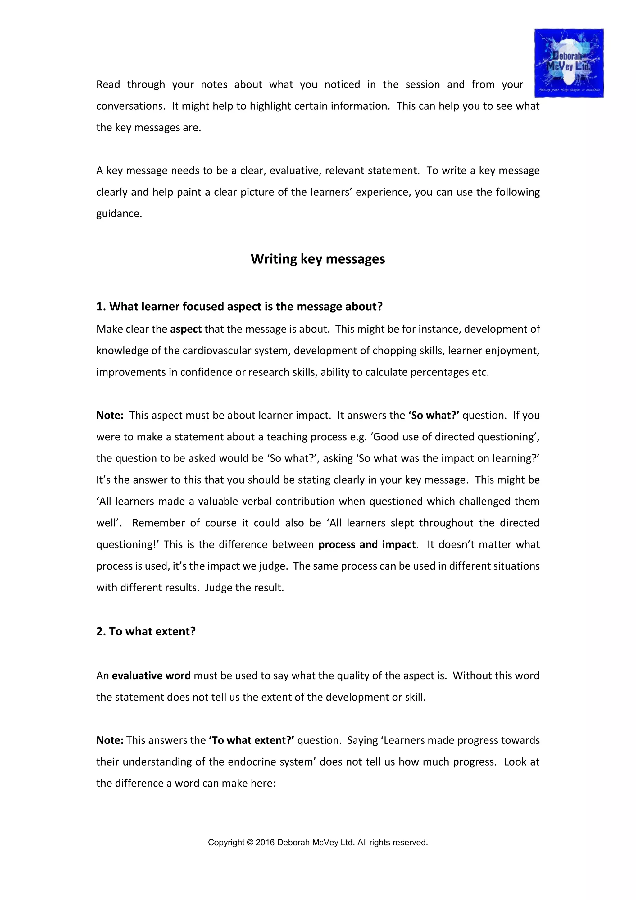 The document provides guidance for writing objective and learner-focused key messages after observing a teaching session. It advises that key messages should: