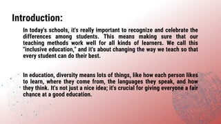 The document discusses the importance of inclusive education and adapting learning materials to accommodate diverse student needs. It emphasizes differentiated instruction, the use of technology, and the incorporation of multiple perspectives and cultural contexts to support all learners. Key strategies include understanding learner profiles, flexible grouping, varying difficulty levels in assessments, and the use of scaffolding to enhance learning experiences.