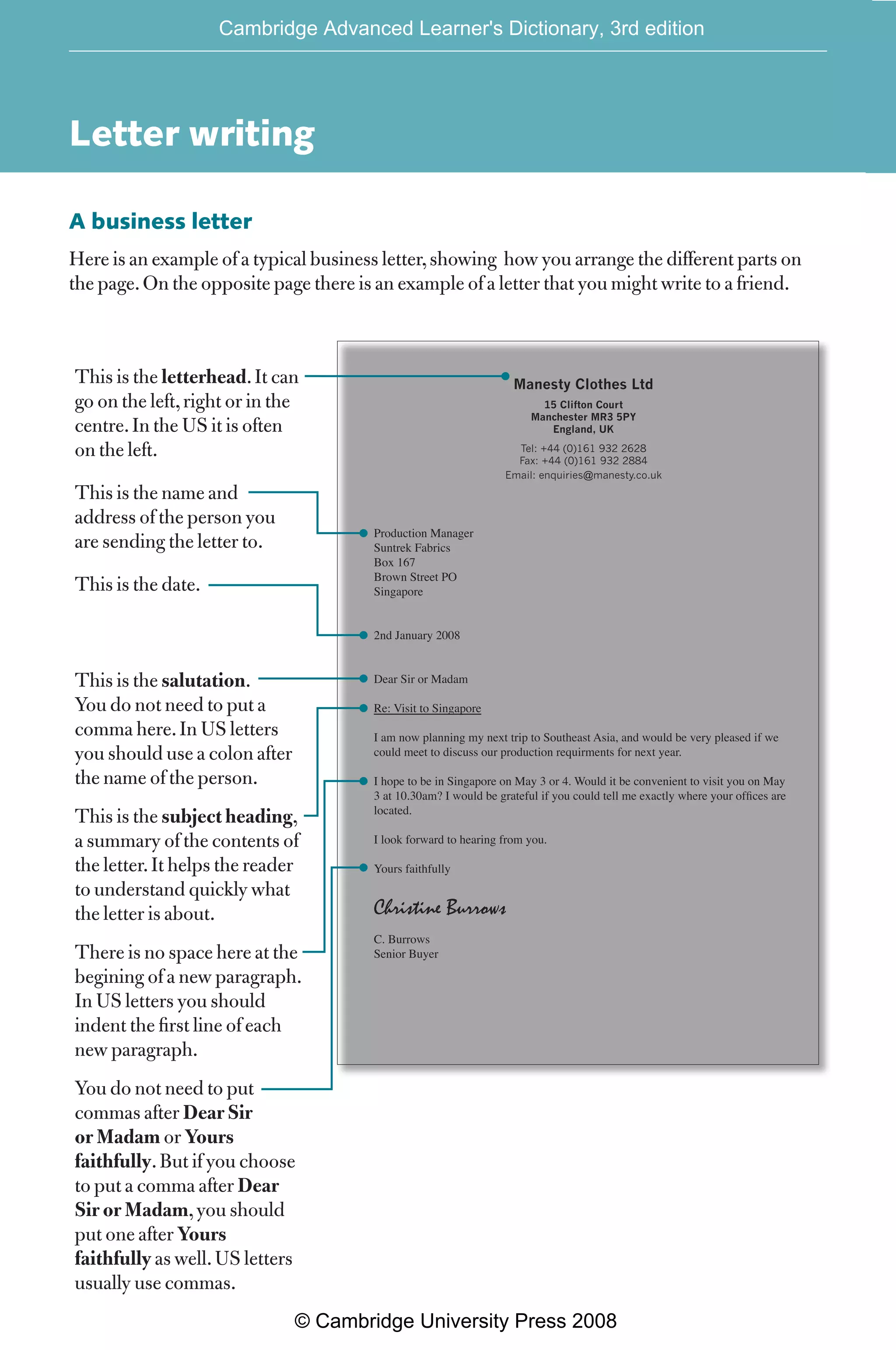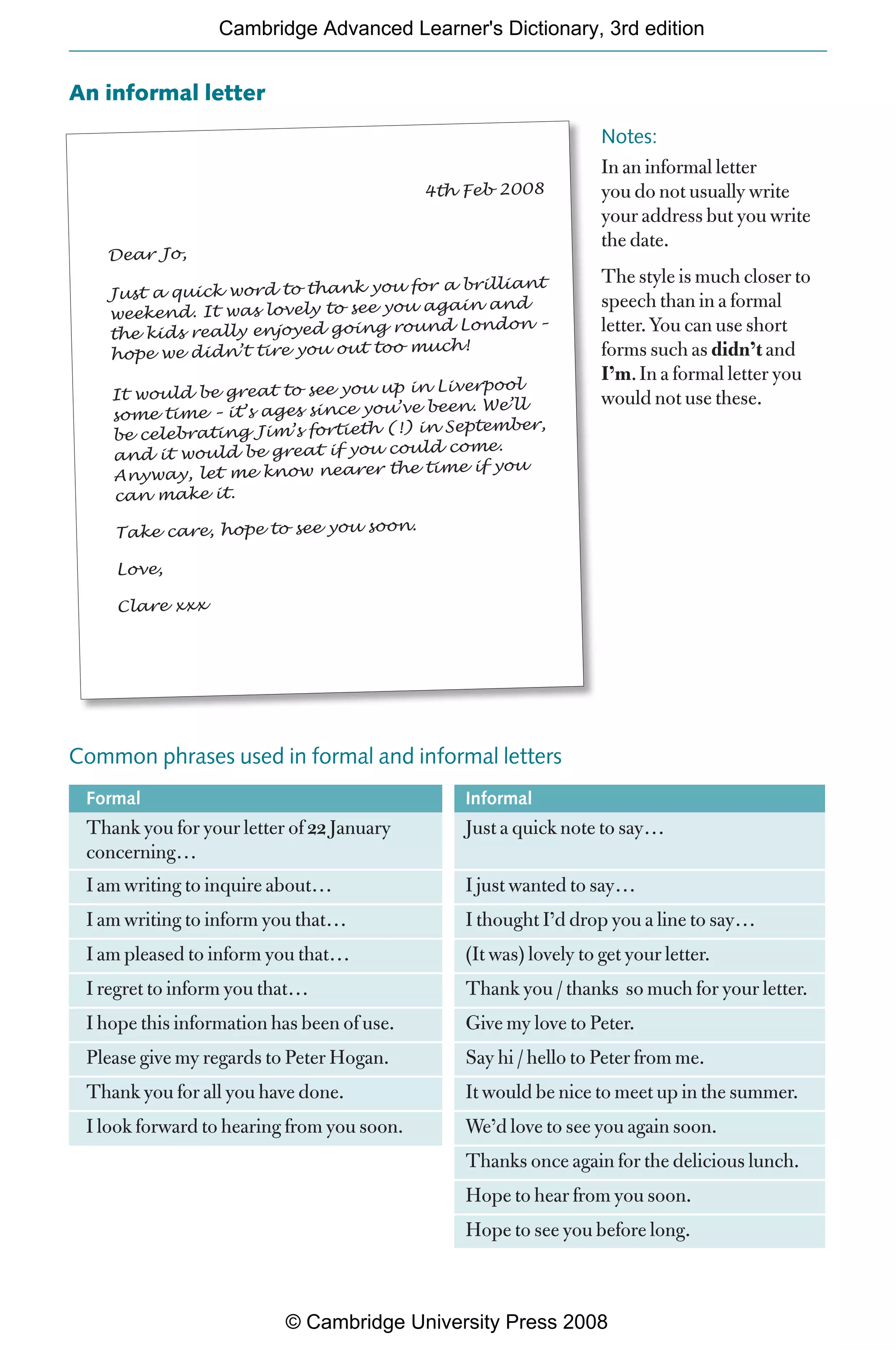 This document provides examples of formal and informal letter writing formats. It shows the typical structure of a business letter, including the letterhead, recipient's address, date, salutation, subject heading, body, and closing. It also provides an example of an informal friendly letter between acquaintances. Common formal and informal phrases used in closing letters are listed and compared.