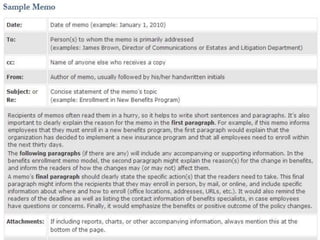 A memorandum (memo) is an informal, internal document used to convey a message within an organization. It should be concise and clearly state the purpose upfront. The standard parts of a memo include a heading with to, from, date and subject fields, an opening paragraph stating the purpose, a body with the main message and any relevant details, and a closing to end courteously without a signature. Memos aim to quickly communicate one main idea to busy recipients in a clear, direct and informal tone.