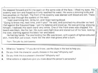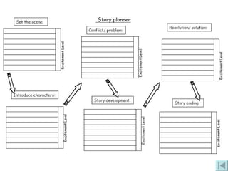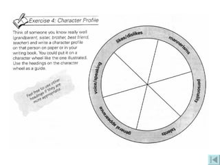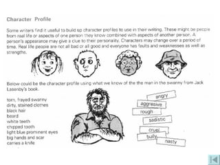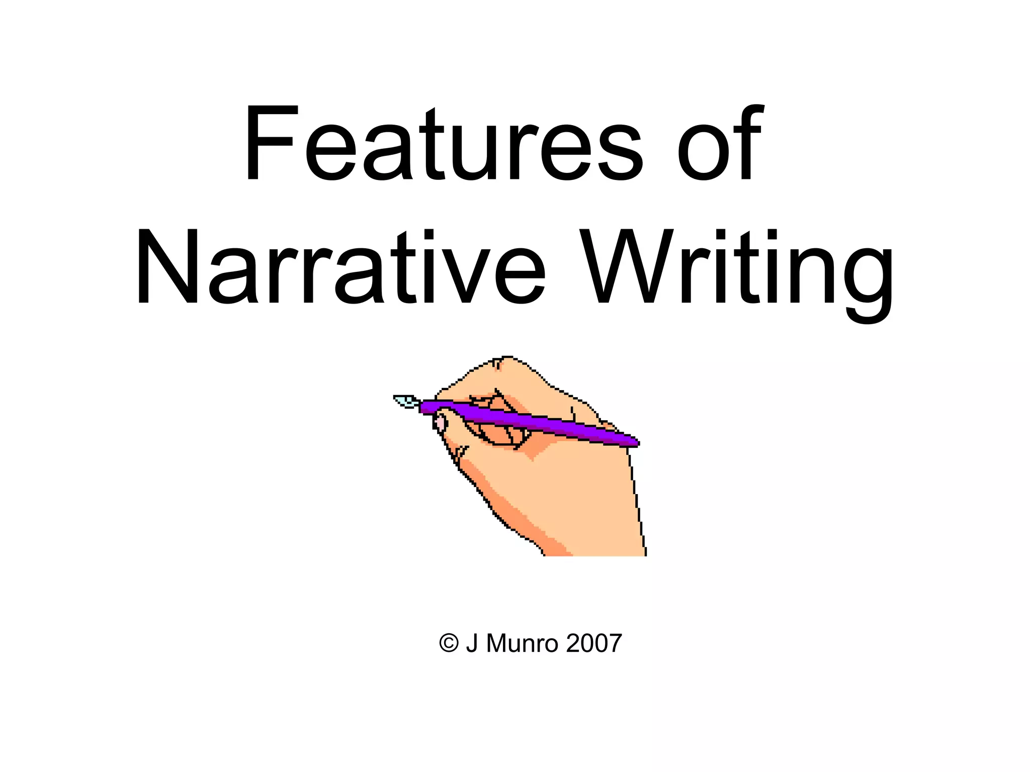 This document provides an overview of key features and concepts for narrative writing, including developing a personal voice, using point of view, structuring a narrative with an orientation, complication, and resolution, crafting openings and endings, developing characters and settings, using descriptive language, and improving dialogue. Tips are given for each element to help writers strengthen their narratives.
