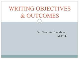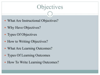 This document discusses instructional objectives and learning outcomes. It defines objectives as specific, measurable behaviors that students will exhibit after instruction. Objectives provide direction for instruction and assessment. Learning outcomes describe the knowledge, skills, and expertise learners will gain. The document outlines different types of objectives and outcomes and provides tips for writing objectives and outcomes, including using action verbs and focusing on observable behaviors.