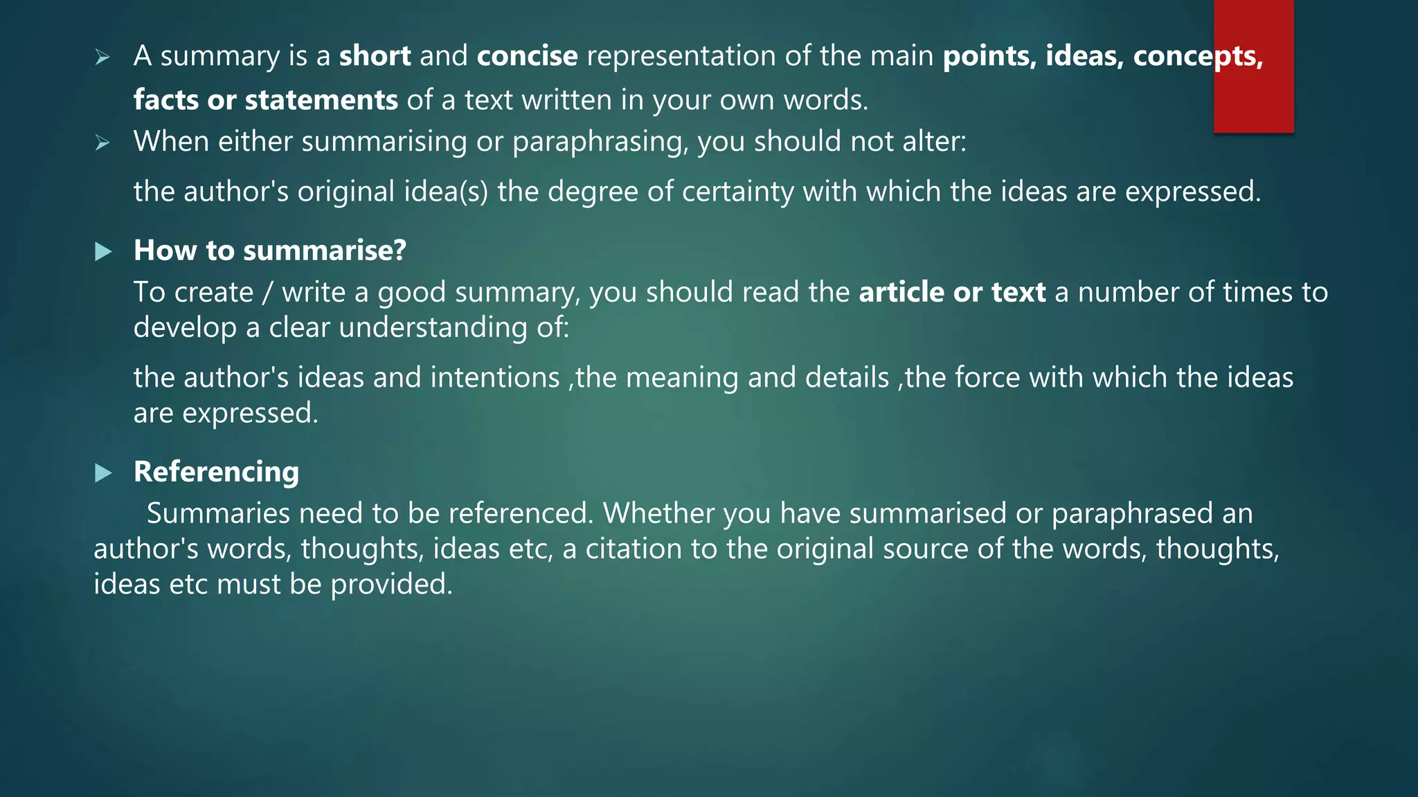 The document provides guidelines for writing summaries and precis, emphasizing the importance of capturing the author's main ideas in one's own words without altering their intention. It outlines steps for effective summarization, including reading the text multiple times, taking notes, and ensuring proper citation of sources. It also details citation formats for different types of literature, highlighting the importance of adhering to specific styles and conventions.