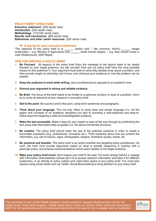 A policy brief is a short, focused document that presents research findings and recommendations for policymakers in a clear, concise manner. It aims to bridge the gap between research and policy by translating complex research into an easily digestible format. An effective policy brief is tailored to its intended audience, provides context about the policy issue and evidence to support persuasive arguments and recommendations. It follows a clear structure and uses simple, jargon-free language to engage time-pressed decision-makers. Writing an impactful policy brief requires understanding audience needs and political realities to ensure the research can inform policy.