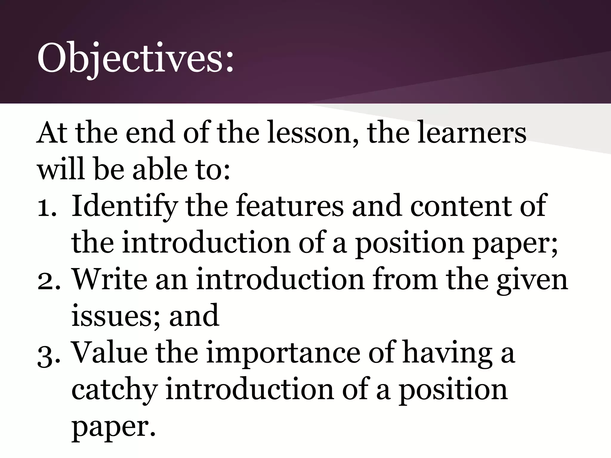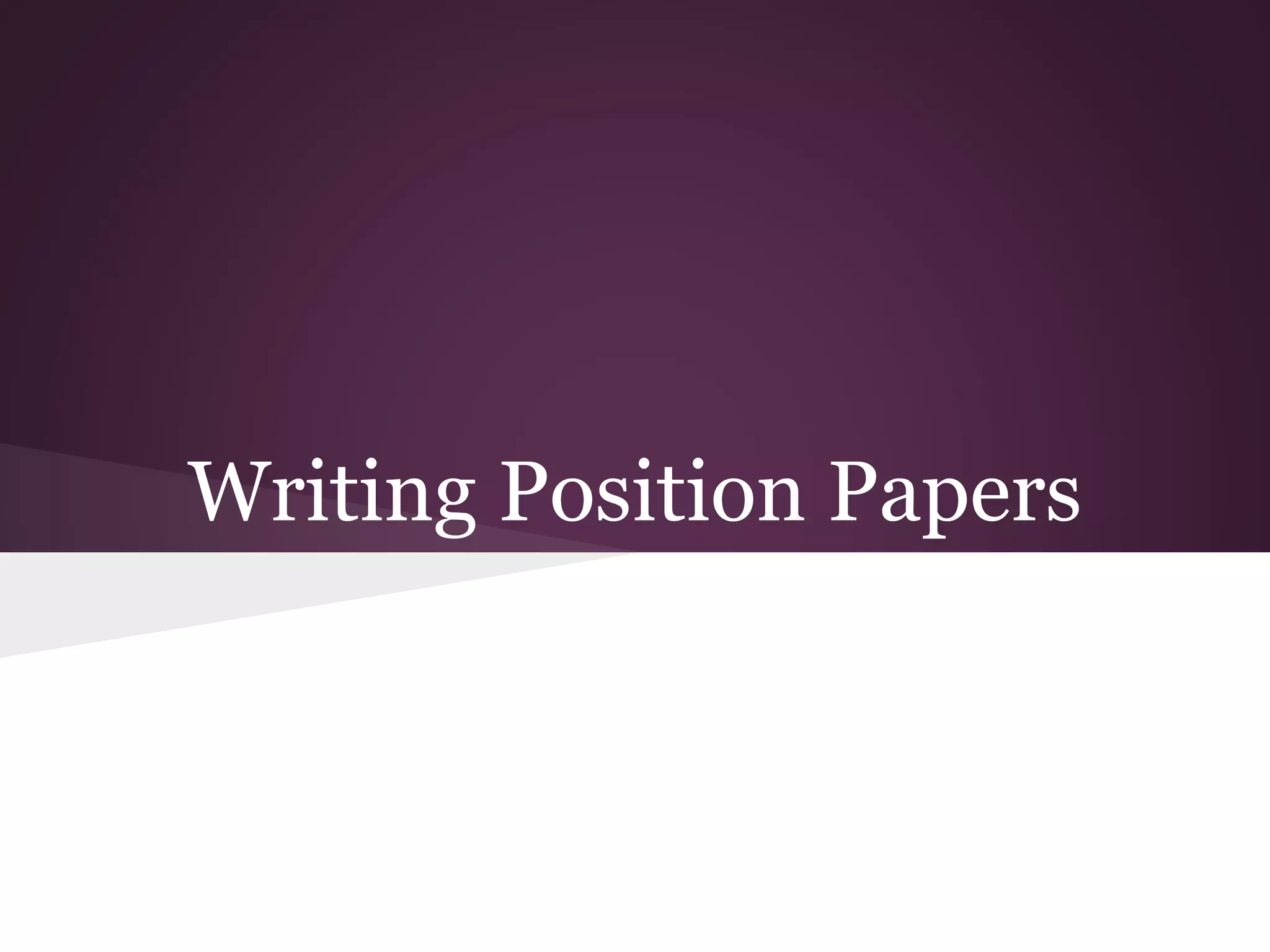 The document provides guidance on writing position papers, including defining what a position paper is, identifying common issues or topics, and outlining the key parts. It recommends including an introduction with a catchy element like an anecdote, fact, or question to engage the reader. The body should present claims and arguments supported by evidence and examples. It concludes by summarizing the main points and making a clear recommendation or call to action.