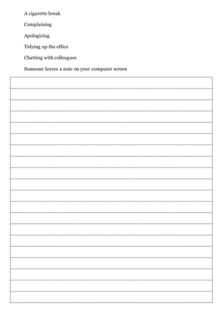 At 2:35 pm yesterday, a laptop containing important data was stolen from a manager's desk at an office. The police are questioning all employees in an attempt to find who committed the crime. The document provides a list of activities for the reader to choose from to create an alibi for their movements at the time of the theft.