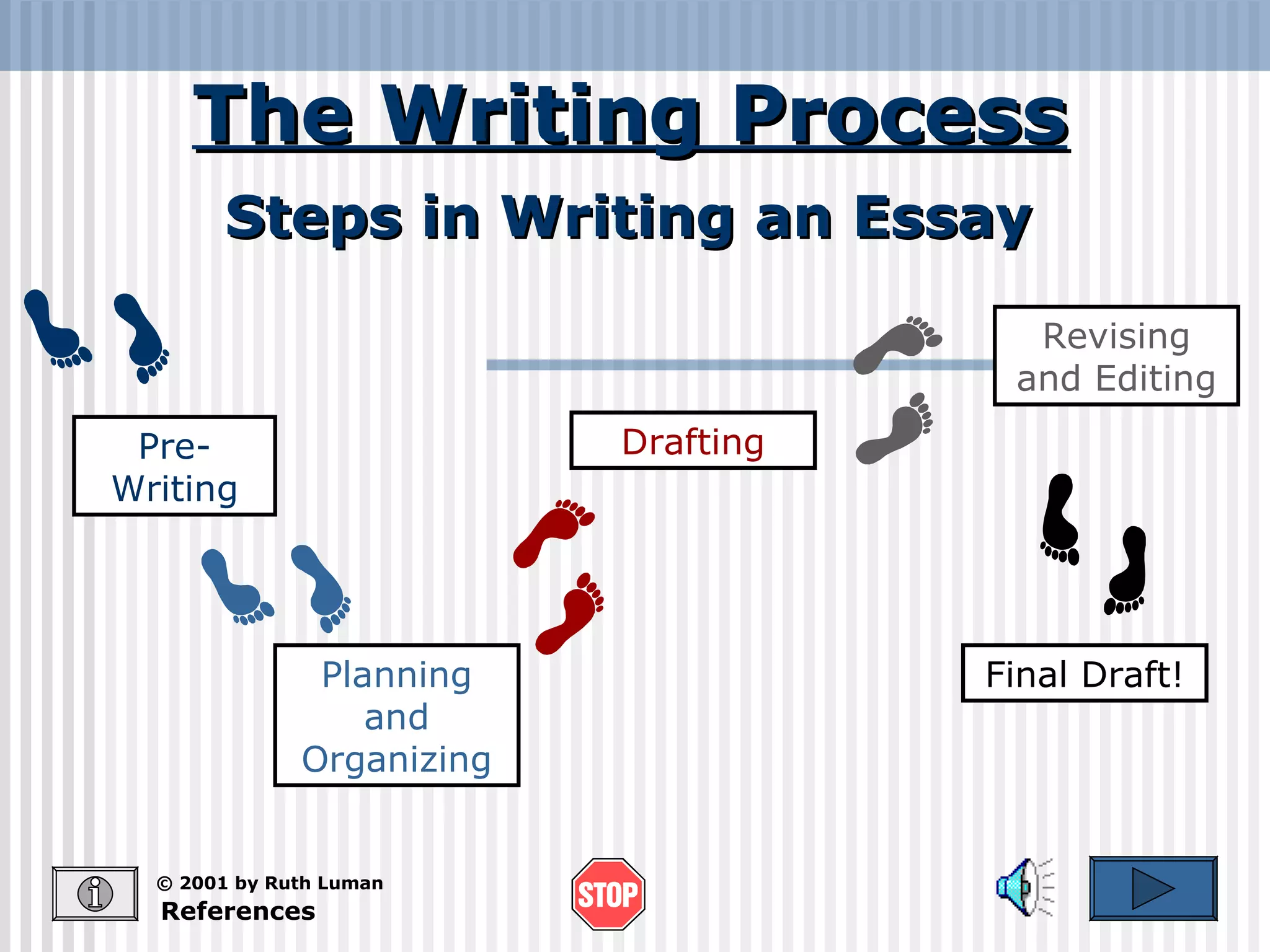 The document outlines the typical steps involved in the writing process: pre-writing (planning and organizing), drafting, revising and editing, and final draft. It describes each step in detail. Pre-writing involves brainstorming ideas, choosing a topic, and creating an outline. Drafting is writing the initial version without worrying about perfection. Revising and editing is improving content, organization, spelling, grammar and punctuation. The final draft is turning in the completed, formatted essay. The writing process is presented as an important series of steps to produce a well-written essay.