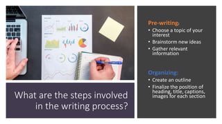 The document outlines the steps involved in the writing process, which includes pre-writing, organizing, drafting, revising, editing, and proofreading. It emphasizes the importance of editing to remove errors and refine ideas for clear communication, along with proofreading to eliminate typographical mistakes. A checklist for effective editing and proofreading is provided to ensure a polished research paper.