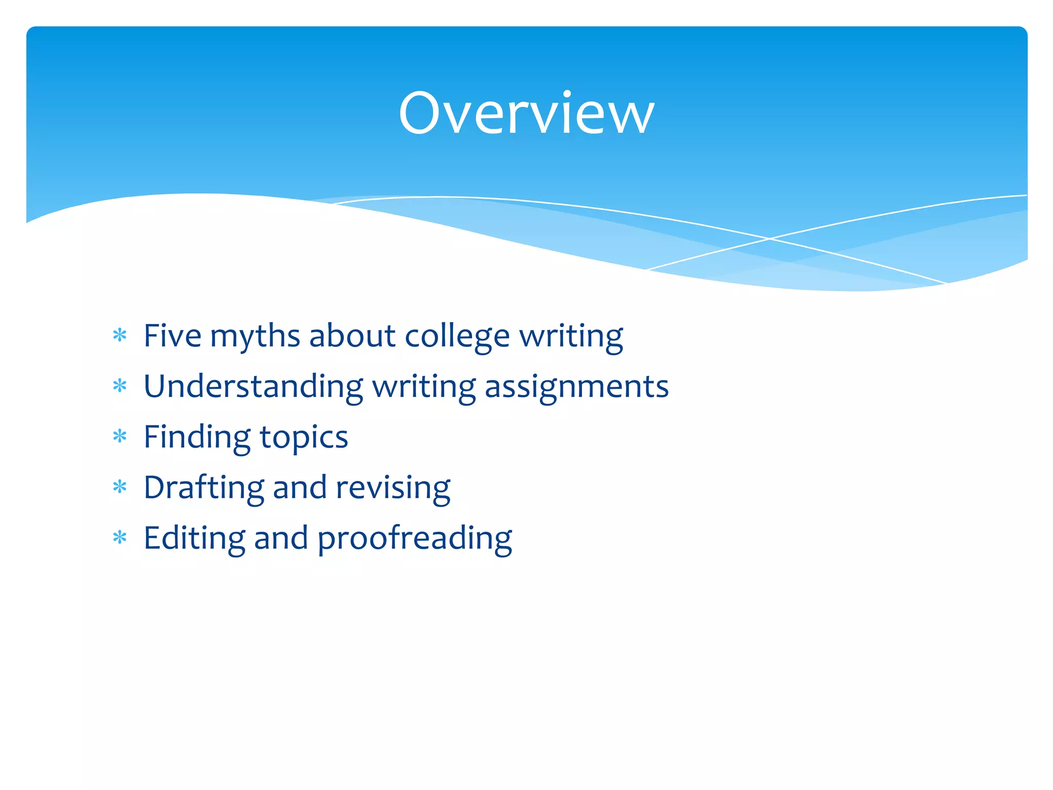 This document discusses strategies for college writing processes. It outlines five myths about college writing, including that perfect drafts are created on the first try and that some people will never be good writers. It also discusses understanding assignments, finding topics, drafting and revising, and editing and proofreading. Key advice includes using invention techniques to find topics, not editing early drafts, getting feedback, and reading widely to improve editing skills. The overall strategies emphasized are drafting, revising with feedback, and careful editing and proofreading.