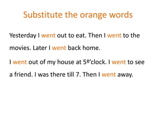 The document provides writing prompts and exercises asking the reader to substitute or avoid certain words, write paragraphs using specified words, and describe something large and something small without directly mentioning size. It includes over a dozen short prompts to spur creative writing on various topics through constrained language exercises.
