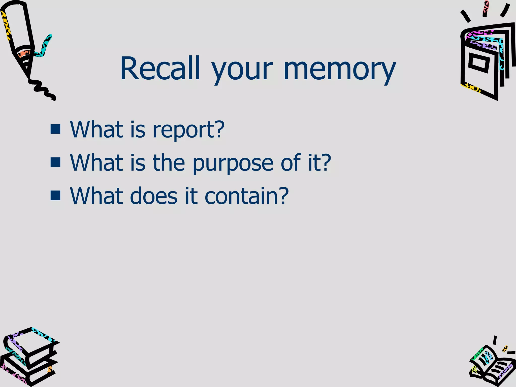 The document provides guidance on effective report writing. It discusses what a report is, its purpose, and essential elements that make a good report, including clarity, completeness, conciseness, consideration, concreteness, correctness, credibility, and creativity. Key recommendations are to choose precise language; construct effective sentences and paragraphs; include all necessary information; be concise while including essential details; consider the reader's perspective; provide specific examples; ensure accuracy; and be creative in presentation.