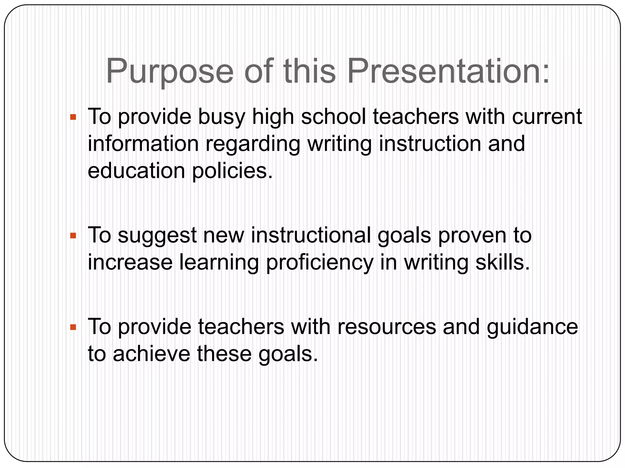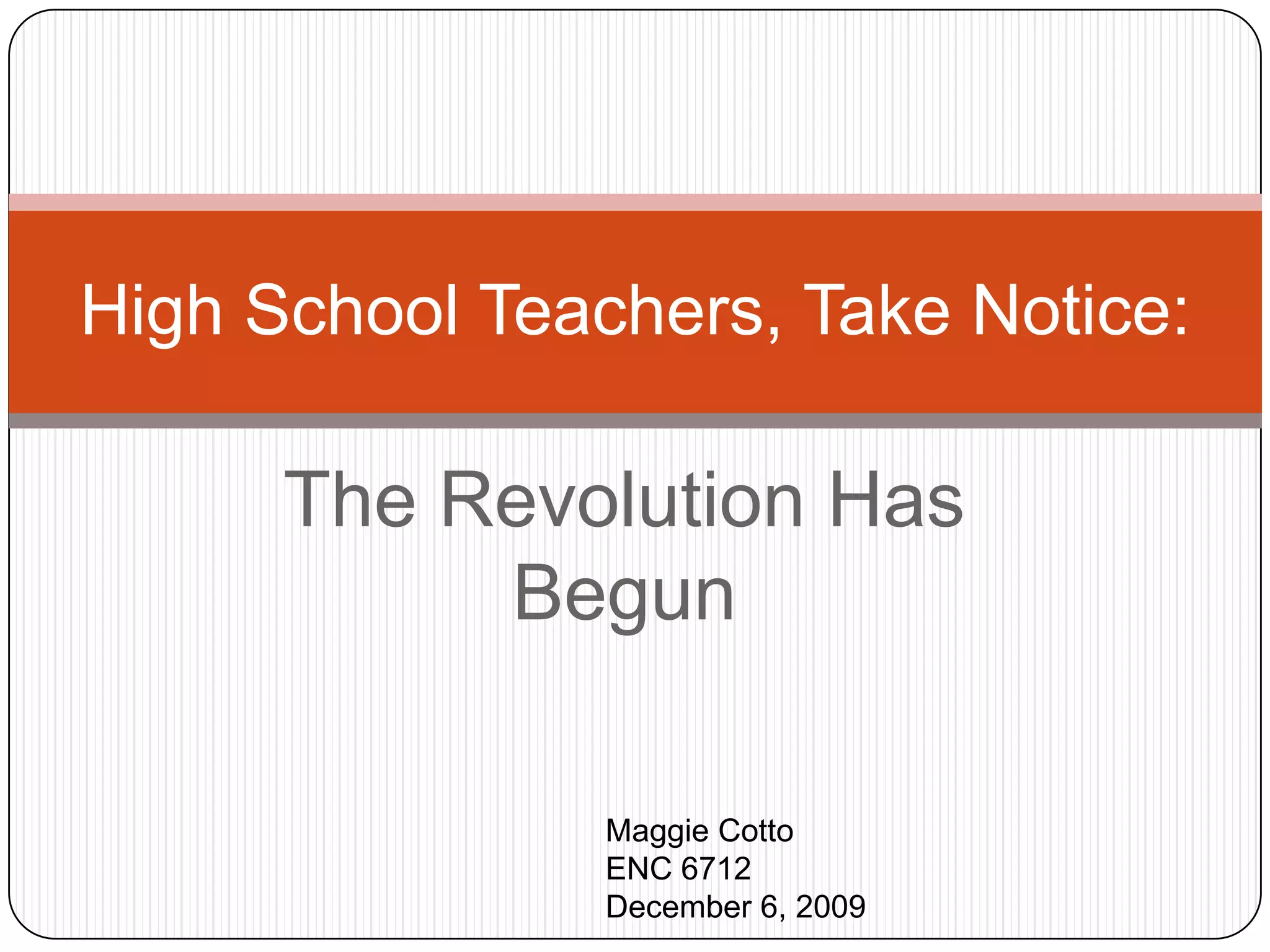 The document addresses the urgent need for a revolution in writing instruction in high schools due to declining student proficiency in writing, as demonstrated by disturbing statistics on student performance. It outlines strategies for improving writing education, including the implementation of a national writing policy, assessment redesign, and the integration of technology, all aimed at aligning high school writing skills with college expectations. The document emphasizes the importance of teaching writing as a social, cognitive, and contextual practice, calling for educators to adapt their methodologies to better prepare students for post-secondary writing demands.