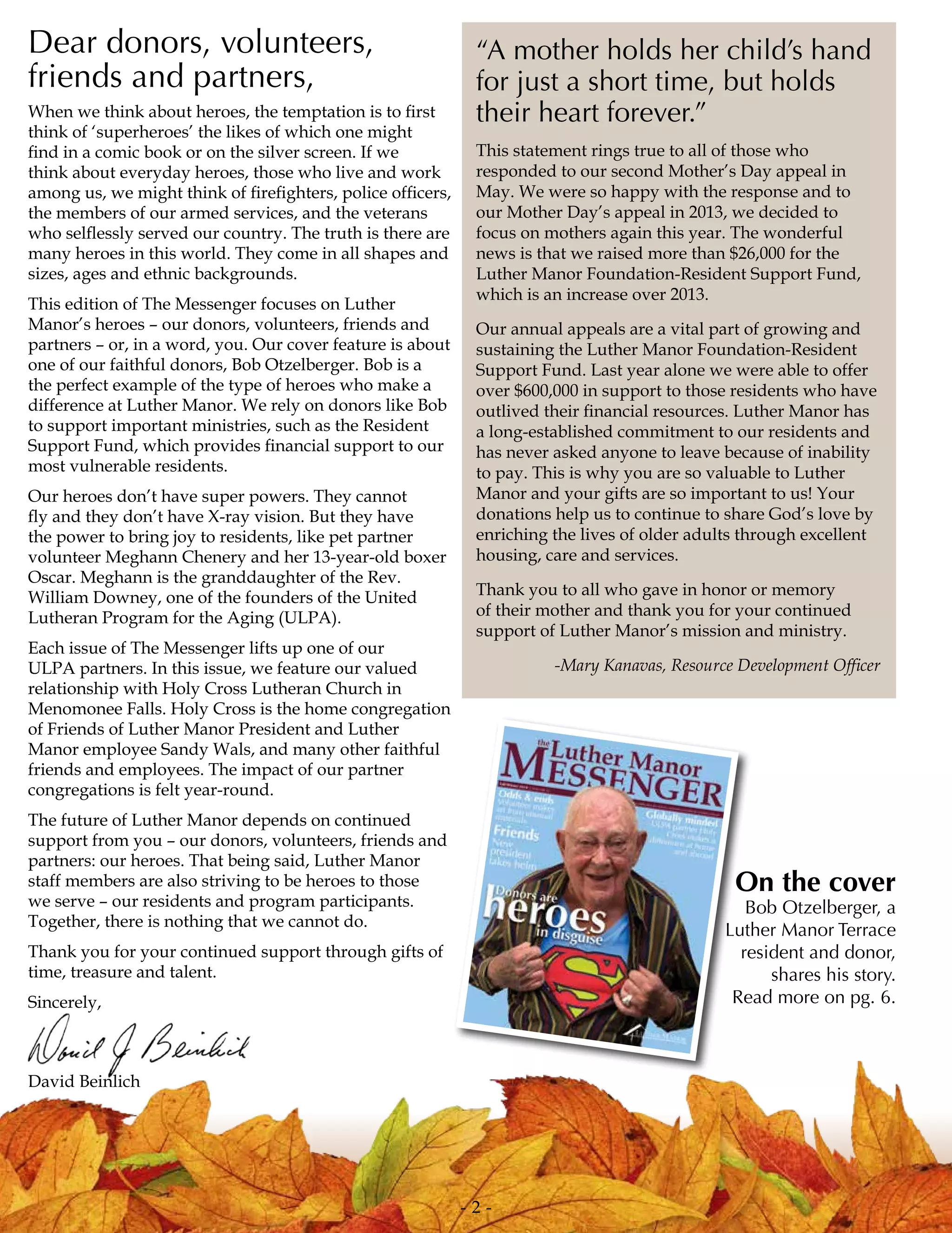 Bob Otzelberger is a faithful donor to Luther Manor who gives in many ways such as responding to annual appeals and purchasing Love Lights. As a Terrace resident, he enjoys exercising, attending services, and playing Wii bowling. Otzelberger values supporting Luther Manor's Resident Support Fund to ensure no one has to leave due to inability to pay.